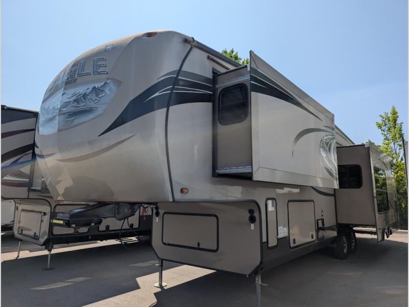 Triple Slide Eagle Premier Fifth Wheel, Rear Kitchen w/Dbl. Kitchen Sink, 3-Burner Range, Microwave, Pantry, Dinette/Hide-a-Bed Slide, Mobile Cabinet, 2-Barstools, Refrigerator/Hutch/Mobile Cabinet Storage/2-Lounge Chairs/End Table Slide, Ward., Entertainment Center, Step Up To Bed/Bath, Toilet, Shower, Lav., Med. Cab., Wardrobe/Queen Bed Slide, Walk-In Closet, Storage, W/D Prep, Chest, Overhead Cabinets Throughout & Much More. Available Options May Include: King Bed, Free-Standing Table/Chairs.