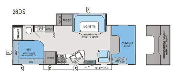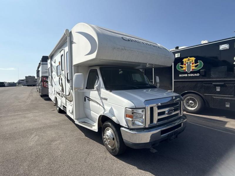 Single Slide Greyhawk Motor Home Class C, Rear Bed w/Large Storage Area Under Bed, Shower, Toilet, Lav., Med. Cab., Linen, Pantry/Refrigerator/U-Dinette w/Drawers Under Dinette Slideout, Wardrobe, 3-Burner Range, Microwave, Double Kitchen Sink, Lounge Chair, LCD TV/DVD, Cab-Over Bunk, Exterior Storage & Much More. Available Options May Include: Cabover Ent. Center w/Pullout Bunk.