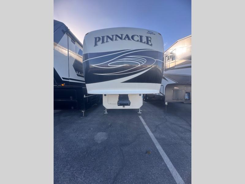Quad Slide Pinnacle Fifth Wheel, Rear Entertainment Center, 2-Lounge Chairs w/End Table, Hide-A-Bed Sofa/Free Standing Table & Chairs Slideout, Counter w/Bar Stools, Refrigerator/Pantry/3-Burner Range/Microwave Slideout, Double Kitchen Sink, Step Up To Bed/Bath, Corner Shower, Lav., Med. Cab., Toilet, Linen, King Bed w/Shelves Slideout, Chest, Storage, Washer/Dryer Prep, Overhead Cabinets Throughout, 16' Awning & Much More. Available Options May Include: Fireplace, 12 cu. ft. Refrig.