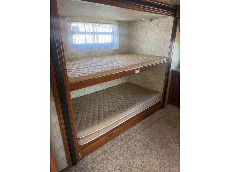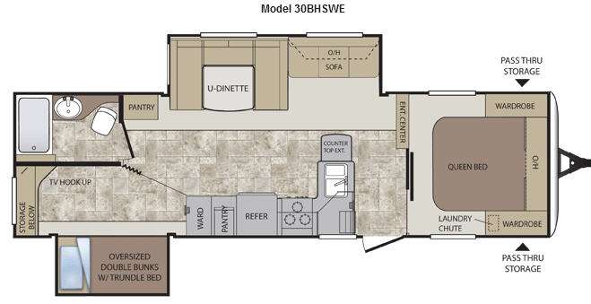 Double Slide Cougar 1/2 Ton Series Bunkhouse Travel Trailer w/Rear Corner Bath Including Tub/Shower, Toilet & Vanity w/Sink, Rear Corner Oversized Bunk Slideout w/Trundle, TV Hook-Up, Storage, Wardrobe, Pantry, U-Dinette & Sofa Slideout w/Overhead Cabinets, 2nd Pantry, Refrigerator, Dbl. Kitchen Sink, Countertop Extension, LCD TV, Front Queen Bed w/Wardrobes, TV Shelf, Laundry Chute, Pass-Thru Storage and More!