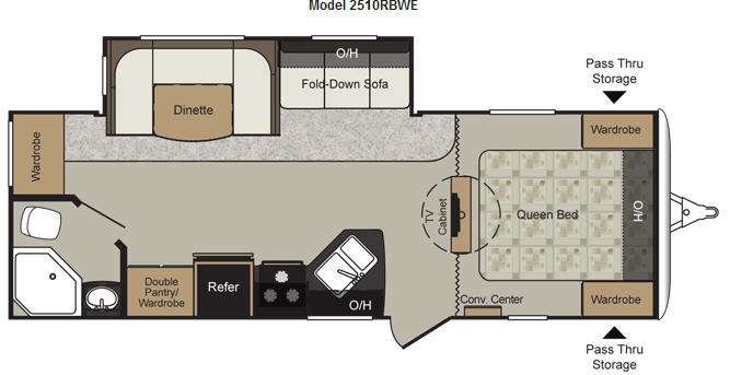 Passport Travel Trailer by Keystone RV w/Rear Corner Bath Including: Angled Shower, Toilet & Sink, Wardrobe, U-Dinette & Fold-Down Sofa Slideout w/Overhead Above, Double Pantry/Wardrobe, Refrigerator, 3 Burner Range, Dbl. Kitchen Sink w/Overhead Storage, Swivel TV Cabinet for Living Area & Bedroom Viewing, Front Queen Bed w/Wardrobes Both Sides, Conv. Center, Front Pass-Thru Storage and More!