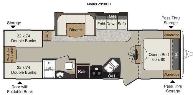 Passport Ultra Lite Grand Touring Bunkhouse Travel Trailer w/Rear Quad Bunks w/Wardrobe w/TV Shelf Between, Exterior Door w/Foldable Bunk, Pantry, U-Shaped Dinette & Fold-Down Sofa Slide w/Overhead Storage Above Sofa, Tub/Shower, Toilet & Vanity w/Sink, Refrigerator, 3 Burner Range, Dbl. Kitchen Sink, Swivel TV, Front Queen Bed w/Wardrobes, Pass-Thru Storage and Much More!