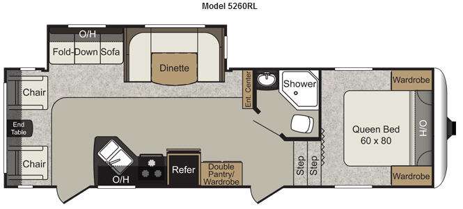 Passport Rear Living Fifth Wheel w/Dbl. Entry, 2 Chairs w/End Table & Overhead Storage, Fold-Down Sofa & U-Dinette Slideout, Ent. Center, Dbl. Kitchen Sink, 3 Burner Range, Refrigerator, Dbl. Pantry/Wardrobe, Side Aisle Bath w/Angle Shower, Toilet & Sink, Step Up to Front Queen Bed w/Wardrobes Both Sides of Bed & Overhead Storage and Much More!