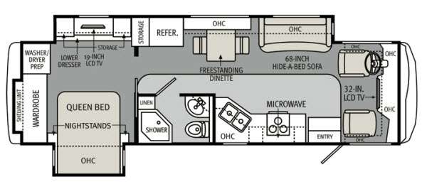 Double Slide Monarch Motor Home, Rear Wardrobe w/Shelving Unit, Washer/Dryer Prep, Queen Bed/Nightstands Slide, Dresser/19" LCD TV/Storage/Refrigerator/Free-Standing Dinette/Hide-a-Bed Sofa Slide, 32" LCD TV Mid-Ship, Microwave, 3-Burner Range, Dbl. Kitchen Sink, Lav., Toilet, Shower, Linen, Overhead Cabinets Throughout & Much More. Available Options May Include: Hardwood Framed Booth Dinette.