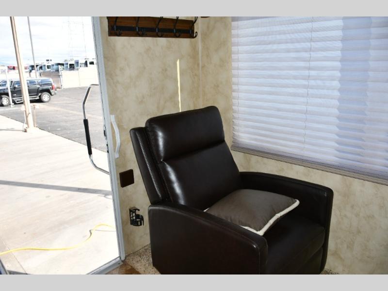Rear Living Area – Two swivel chairs, sofa, overhead cabinets, and free-standing dinette slide
