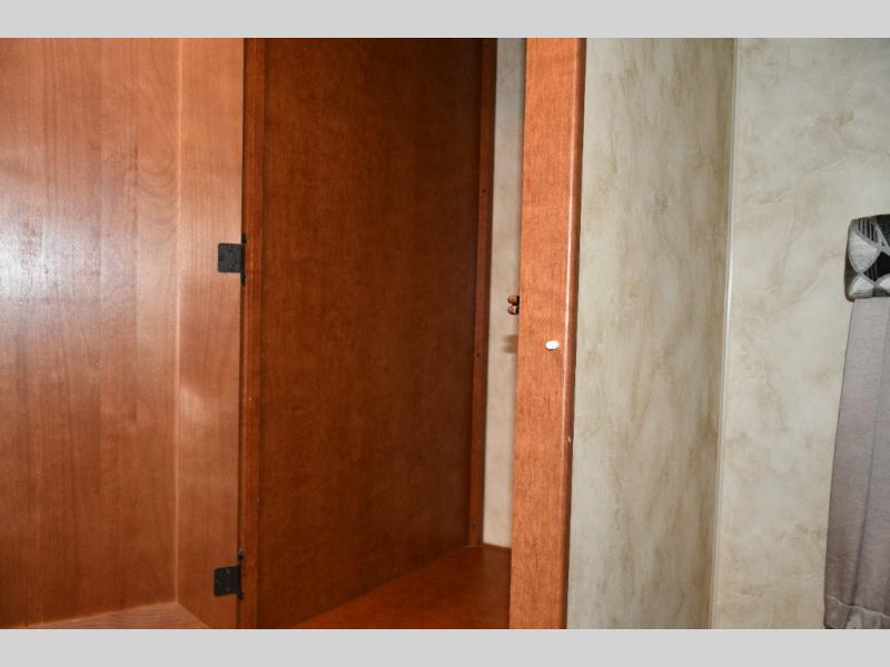 The private front bedroom offers a queen bed, wardrobes on either side, a laundry chute, and a private entry, creating a personal retreat at the front of the trailer.