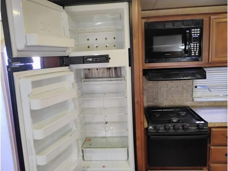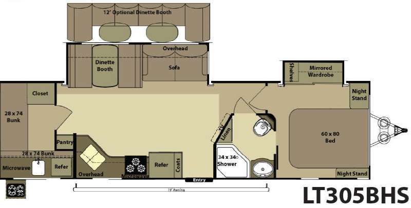 Open Range Light Travel Trailer w/Rear Bunkhouse Including: Closet, Bunk Beds, 3rd Bunk Above Exterior Kitchen w/Refrig., Sink, Microwave & Stove Top, Pantry, Dbl. Kitchen Sink, 3 Burner Range w/Microwave Above, Refrig., Coat Closet, Booth Dinette & Sofa Slideout, TV, Side Aisle Bath w/Angled Shower, Sink, Toilet & Linen Cabinet, Door to Front Queen Bed w/Nightstands, Mirrored Wardrobe Slideout w/Shelves and Much More!