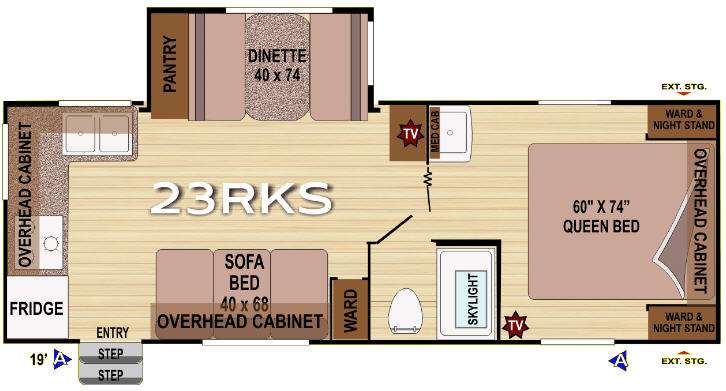 Creek Side Travel Trailer w/Rear Kitchen Including: Refrig., 3 Burner Range, Dbl. Kitchen Sink, Overhead Storage Cabinet, Sofa Bed w/Storage Above, Slideout Pantry & Booth Dinette, TV, Wardrobe, Private Toilet & Tub/Shower w/Skylight, Separate Sink, Front Queen Bed w/Wardrobes Above Nightstands Both Sides of Bed, Front Exterior Storage and Much More!