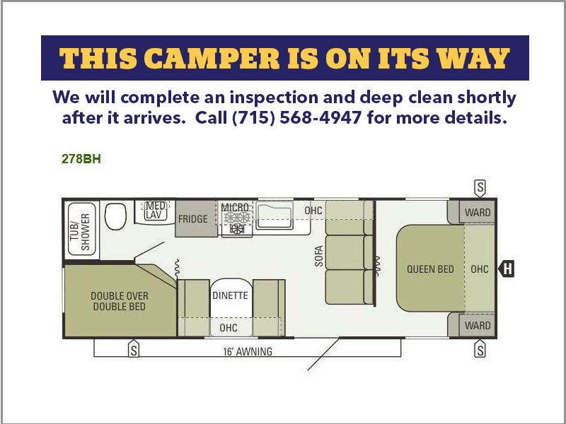 Starcraft Autumn Ridge Travel Trailer w/Rear Corner Tub/Shower, Toilet & Lav. w/Med. Cabinet, Rear Corner Double Bed w/Dbl. Bed Bunk Above, Booth Dinette w/Overhead Storage, Sofa, Refrigerator, Microwave Above 3 Burner Range, Front Queen Bed w/Shirt Wardrobes Above Nightstand, Front Overhead Storage, 16' Awning, Front Pass-Thru Storage, Rear Storage Below Bunks and More!