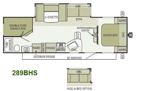 Starcraft Autumn Ridge Bunkhouse Travel Trailer w/Rear Corner Dbl. Bed Bunks, Rear Corner Bath w/Toilet, Tub/Shower & Separate Sink, Wardrobe, Pantry, Refrigerator, 3 Burner Range w/Micro., Kitchen Sink, Counter Top Extension, U-Dinette & Sofa Slideout, Overhead Cabinet Above Sofa, Ent. Center, Front Queen Bed w/Wardrobes Both Sides of Bed, Front Pass-Thru Storage, Exterior Refrig., and More! Available Options May Include: Hide-A-Bed.