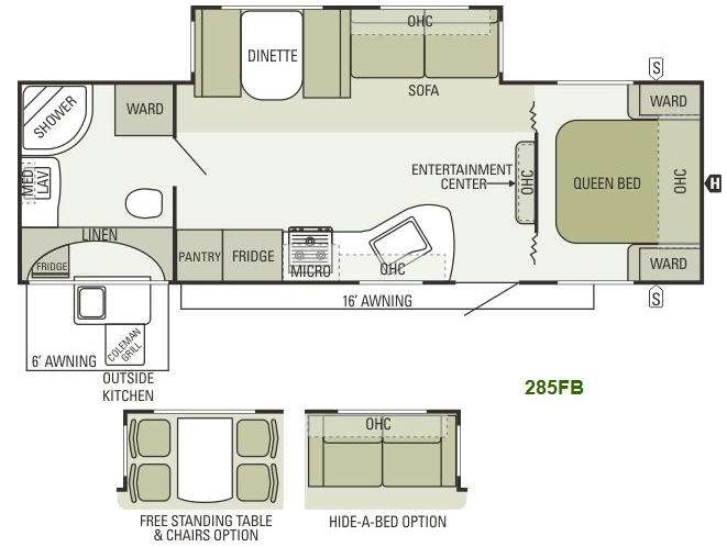 Travel Star Travel Trailer by Starcraft w/Rear Bath Including: Corner Shower, Toilet, Lav. w/Med. Cabinet Above, Linen Cabinet, Wardrobe, Booth Dinette & Sofa Slideout w/Overhead Above Sofa, Pantry, Refrigerator, 3-Burner Range w/Microwave, Kitchen Sink, Ent. Center w/Overhead Storage, Front Queen Bed w/Wardrobes Both Sides, Exterior Kitchen w/Refrig., Sink & Stove, 16' Awning and Much More! Available Options May Include: Free Standing Dinette & Chairs, Hide-A-Bed.