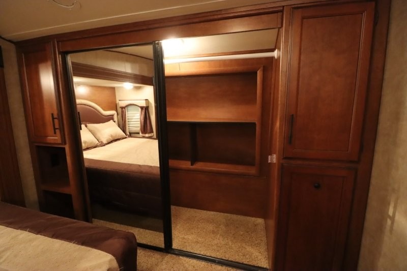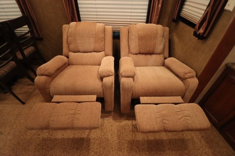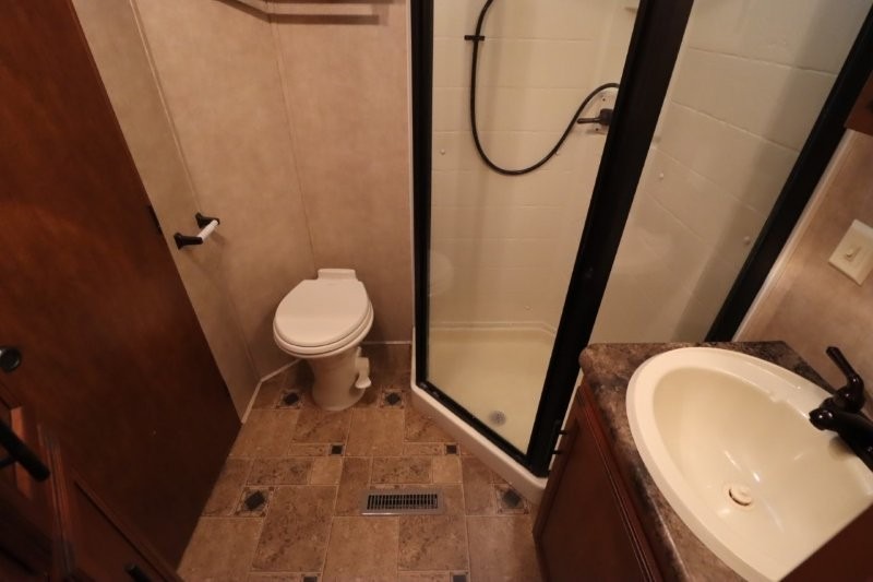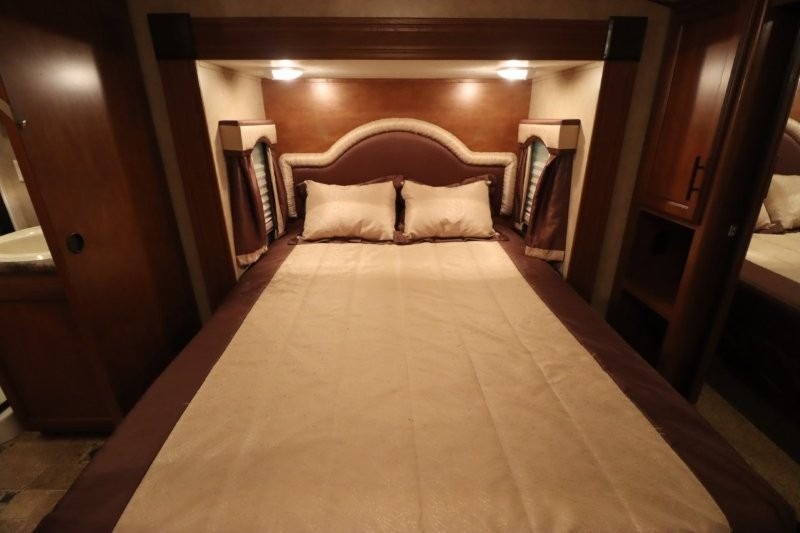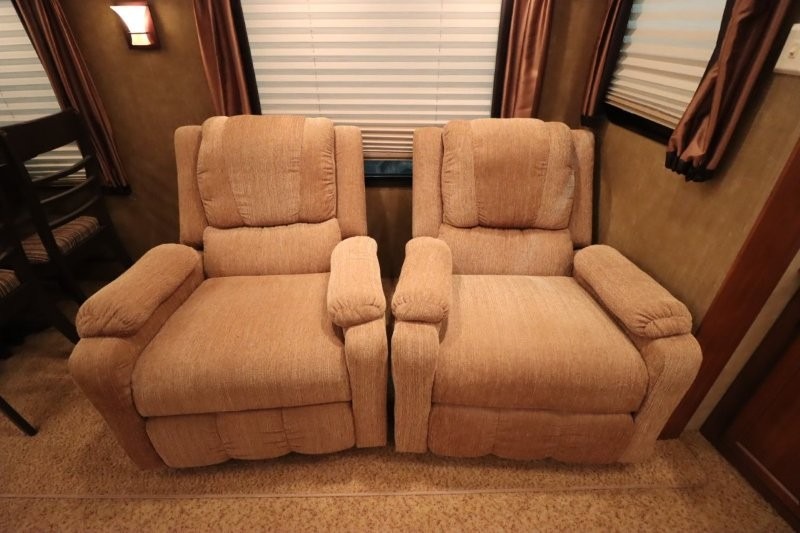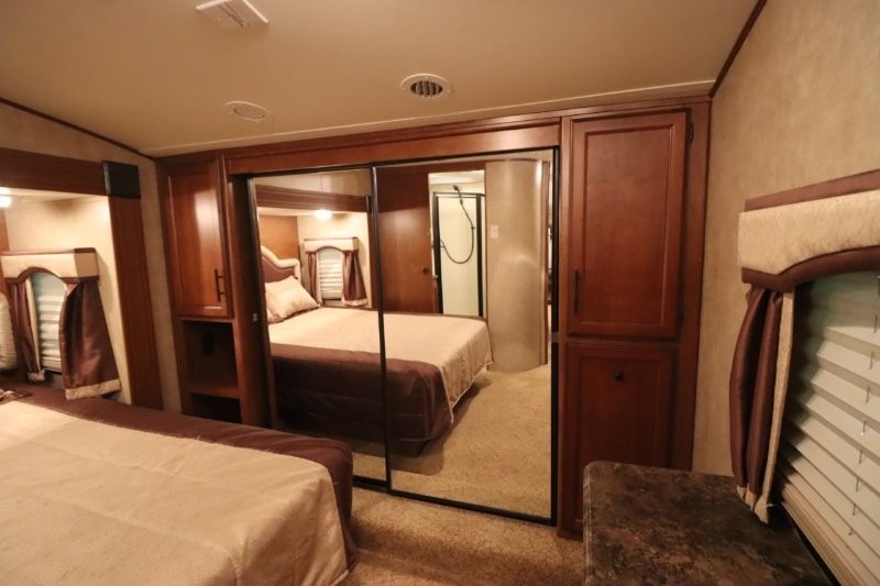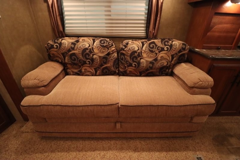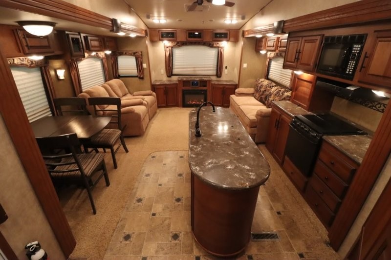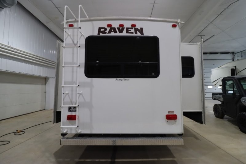 Rear Living SunnyBrook Raven Fifth Wheel Proudly Built by Winnebago Industries Towables w/Full Wall Ent. Center, Sofa & Galley Slideout w/3 Burner Range, Overhead Cabinets, Booth Dinette & Swivel Rockers Slideout, Kitchen Island w/Dbl. Sink, Refrigerator, Pantry, Step Up to Side Aisle Bath w/Angle Shower, Toilet & Sink, Front Queen Bed Slide, Vanity, Wardrobes w/Dbl. Chest of Drawers and Much More! Avail. Options May Include: Fireplace, 19" LCD TV in Bedroom.
