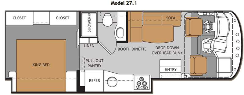 Ace Class A Motor Coach w/Rear King Bed Slide w/Ward./Nightstand/Pull-Out Pantry/Refrig./Round Sink & 3 Burner Range w/Microwave Above, Bedroom Closets w/Overhead, Bath w/Toilet, Vanity w/Sink, Linen Cabinet, L-Shaped Booth Dinette/Sofa w/Table & Overhead Storage, Drop-Down Overhead Bunk Above Cab Area and Much More!