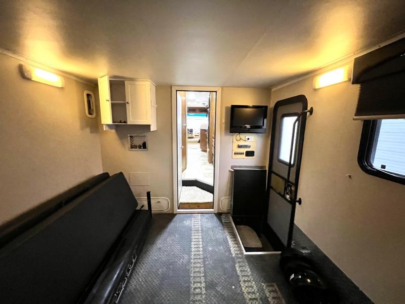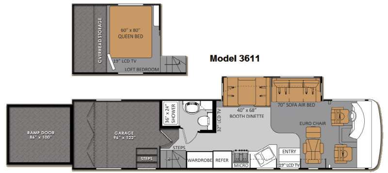 Single Slide Outlaw Class A Toy Hauler by Thor Motor Coach w/Rear Ramp Door & Pneumatic Lift Assist to Garage Space w/Loft Bedroom Above, Side Entry Door in Cargo, Queen Bed in Loft w/Nightstand, 19" LCD TV, Overhead Storage, Side Man Door in Garage, Door to Living Area w/36" x 24" Shower, Toilet & Vanity w/Sink, Wardrobe, Refrig., 3 Burner Range w/Micro., Dbl. Kitchen Sink, Slideout Booth Dinette & 70" Sofa Air Bed w/Overhead Storage, 32" LCD TV, Euro Chair, 19" LCD TV Above Entry Door, & More!