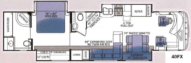 Tuscany Class A Diesel Coach w/Rear Full Bath Including: Wardrobe, Corner Shower, Toilet & Vanity w/Sink, Slideout King Bed, Chest of Drawers w/32" LCD TV/Linen/84" Expanding Sofa w/Twin Air Mattress & 74" Buffet Dinette Full Wall Slide, 32' Exterior TV, 1/2 Bath , 40" LCD TV w/Fireplace Below, Linen Cabinet, Dbl. Kitchen Sink/3 Burner Range w/Microwave/C-Top Pull-Out/Refrig & Pantry Slide, and Much More!