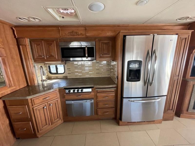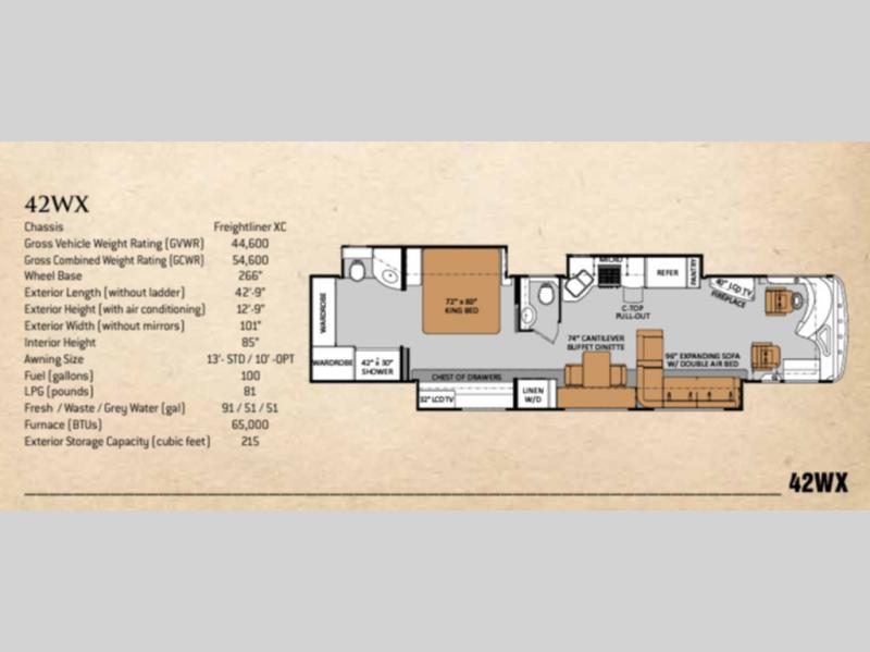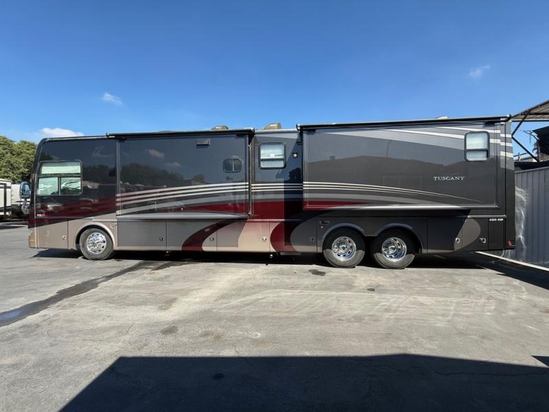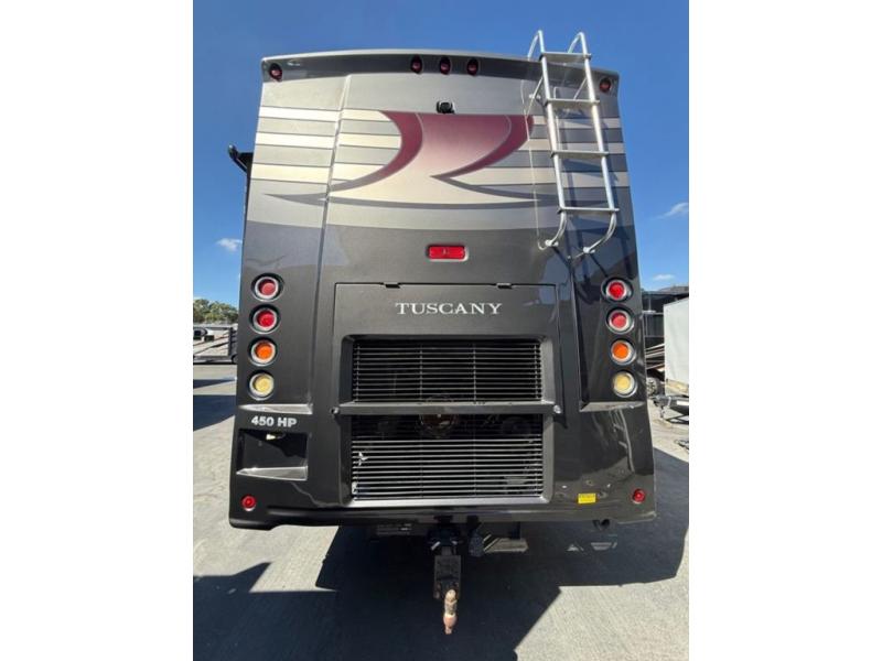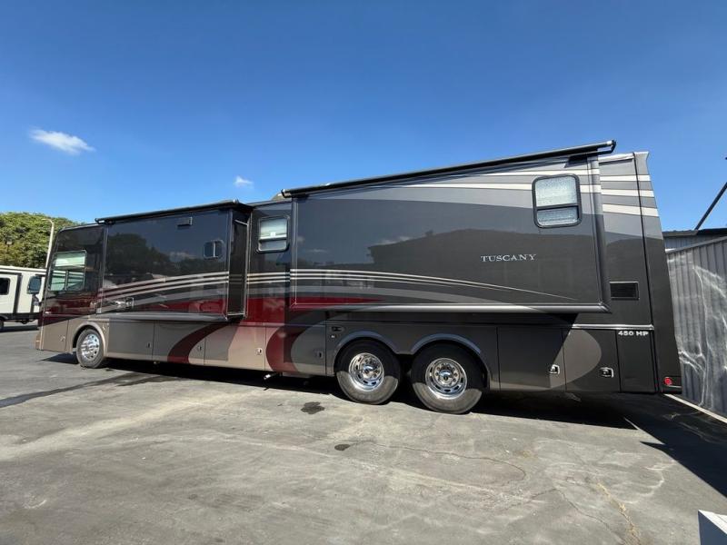 Tuscany TAG Class A Diesel Coach w/Rear Bath w/42" x 30" Shower, Wardrobes, Toilet/Lav./King Bed & Nightstands Slideout, Bedroom Chest of Drawers w/32" LCD TV/Overhead Storage, Linen Cab. w/Washer/Dryer/74" Cantilever Buffet Dinette & 96" Expanding Sofa w/Dbl. Air Bed Full Wall Slide, 40" LCD TV w/Fireplace Below in Living Area, Slideout Pantry/Refrig./Pull-Out C-Top/3 Burner Range w/Micro. Above & Dbl. Sink Slide, 1/2 Bath and Much More!