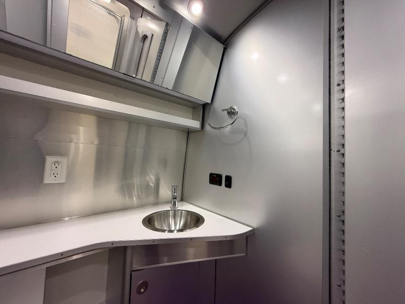 The galley has a sink, three burner range, and pantry on one side of the travel trailer. On the opposite side you will find a refrigerator.