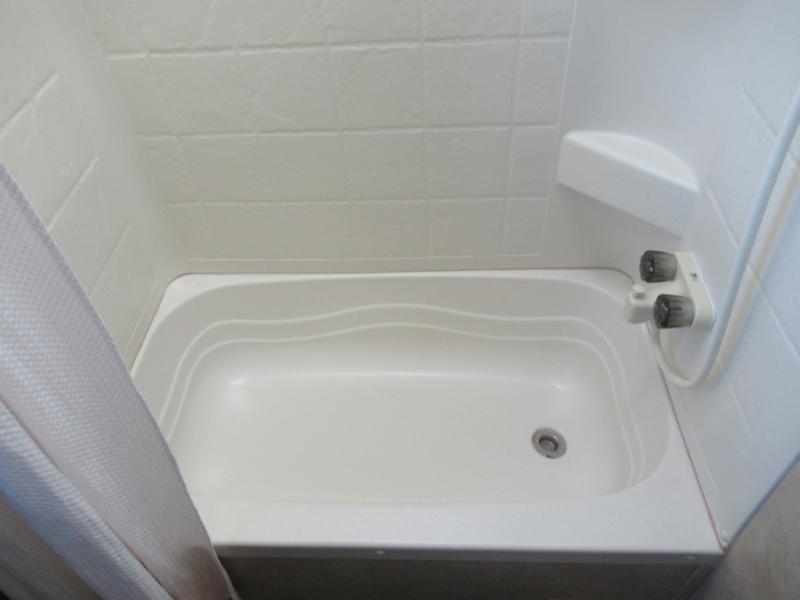 Looking toward the rear of the unit there are double bed bunks in the right corner with a ladder for easy access to the top bunk. There is a small wardrobe just outside the bathroom for storing clothes and things. The other corner features a complete bath with private entry and includes a toilet, sink, and 40" tub.
