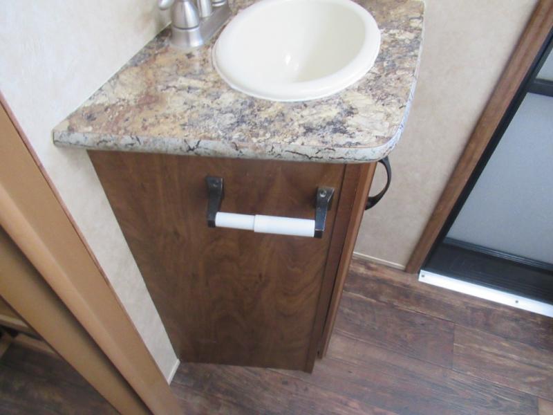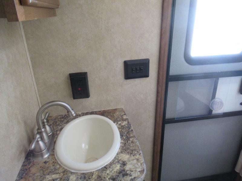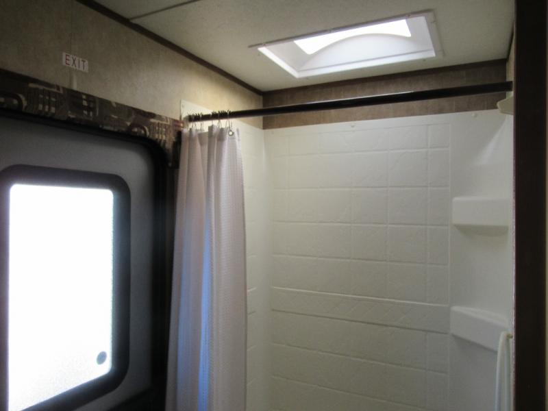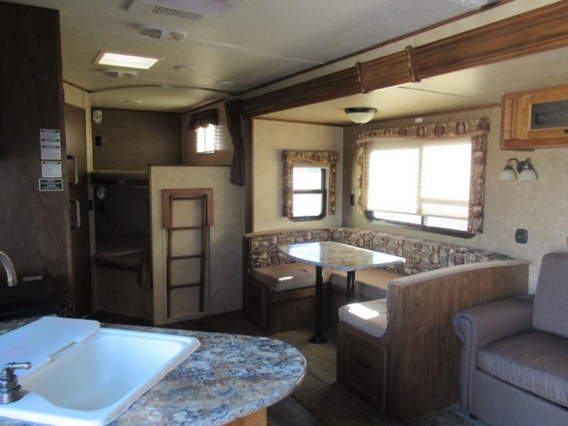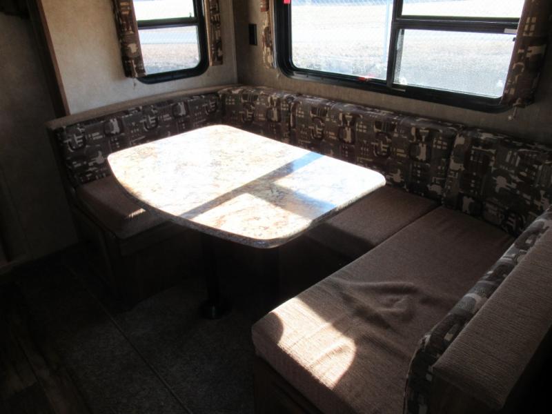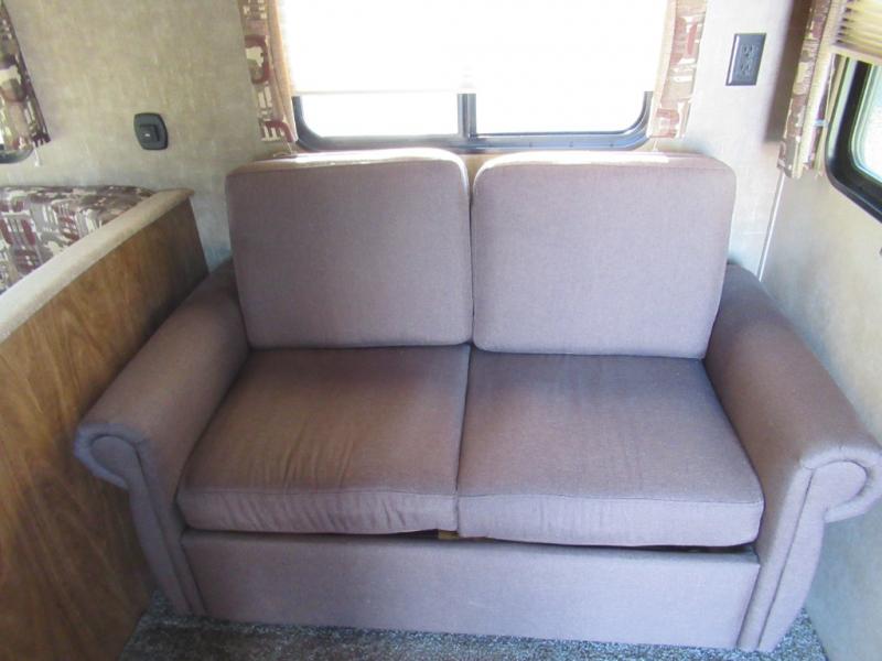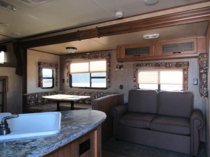 As you step inside you will be greeted by a large interior kitchen and living space with a single slide out u-shaped dinette for mealtime, and a sofa with overhead storage.