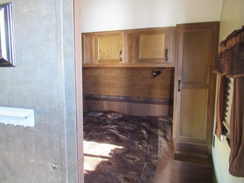 The front bedroom features a comfy queen bed with shirt closets on both sides of the bed, plus an overhead cabinet too.