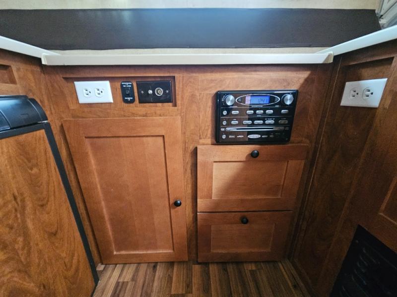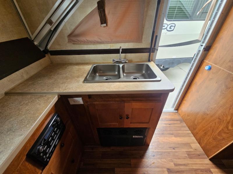 One side of the camper has a dinette which converts into a single bed, two burner range, and refrigerator below the range. Across from the range there is a double kitchen sink. There are also plenty of storage drawers in the galley area.