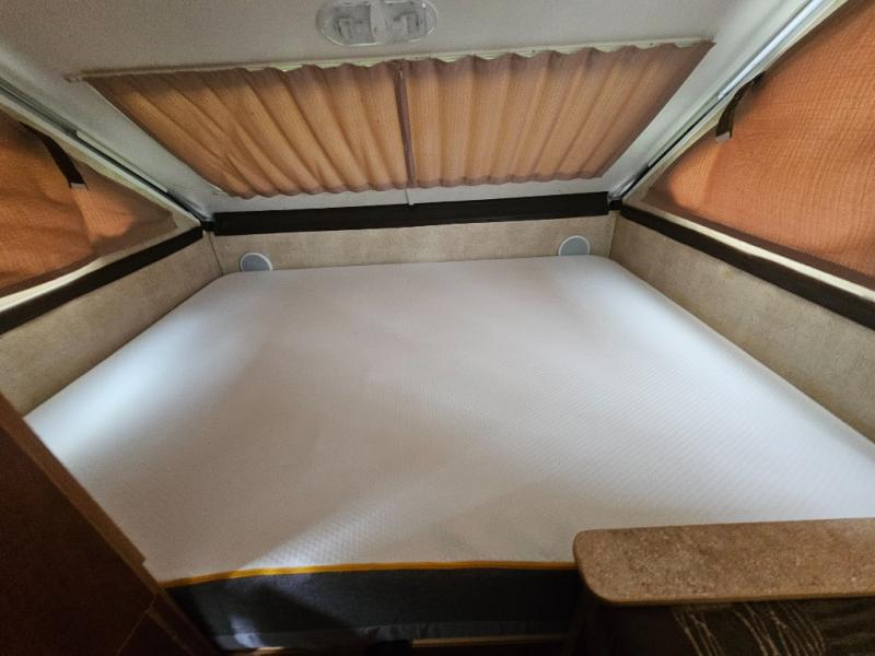 The XL 1935 folding pop-up camper by Chalet offers a rear bed with storage below the bed.
