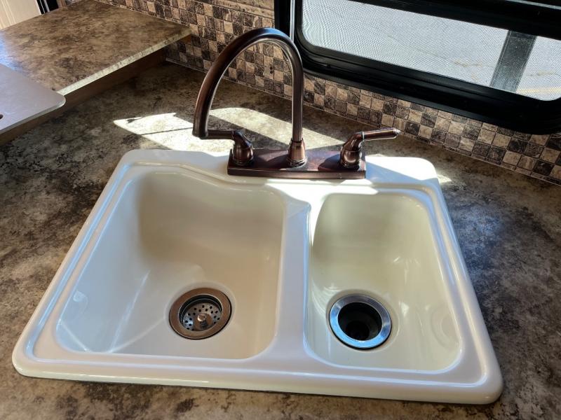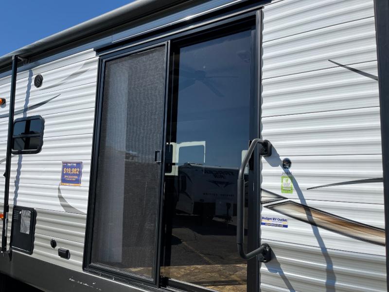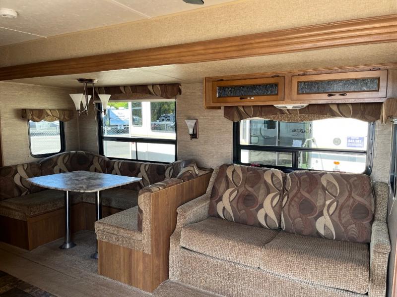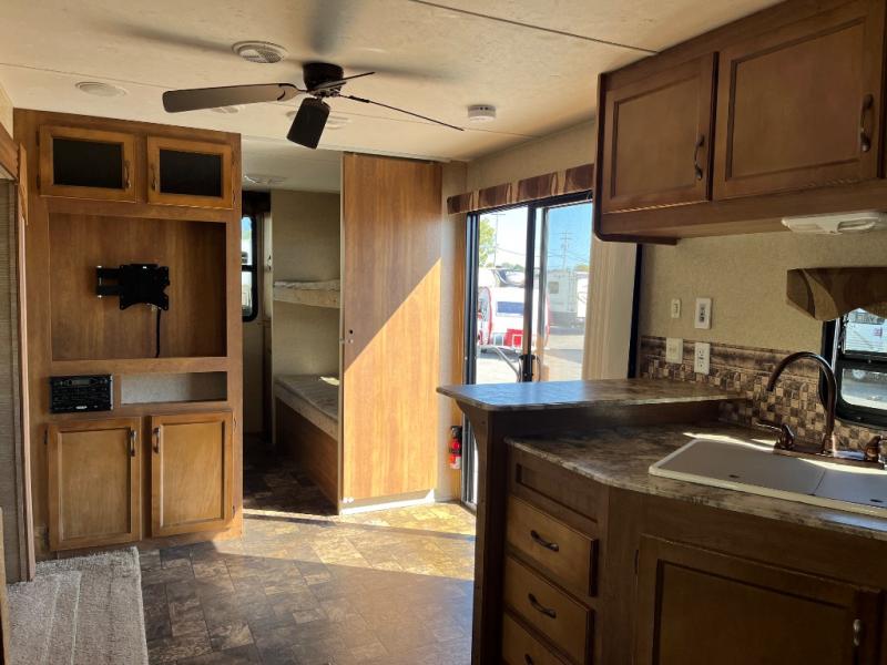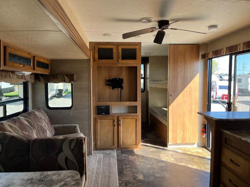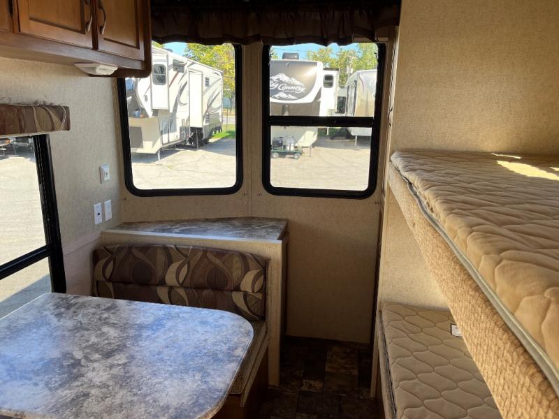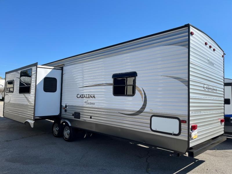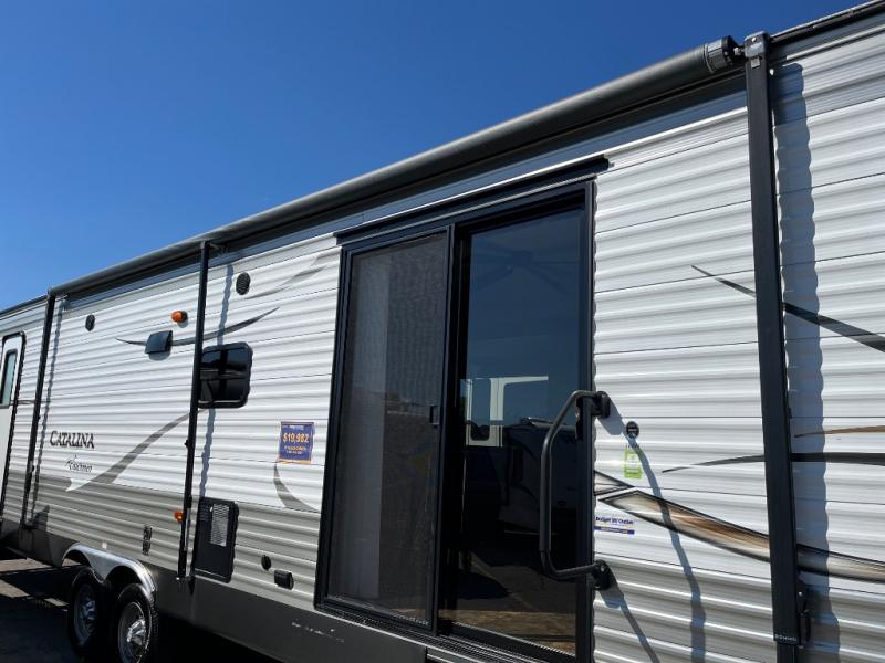 Catalina Destination Trailer w/Rear Queen Bed w/Wardrobes Both Sides, Private Bedroom Entry, Walk-Thru Bath w/Angle Shower w/Glass Door, Toilet, Linen Cabinet, Sink w/Med. Cabinet, Closet w/Shelf, Res. Refrig., Pantry, Range w/Micro. Above, Kitchen Sink, Overhead Storage, Breakfast Bar w/Stools, U-Shaped Dinette & Sofa Slide, TV Ent. Center, Patio Door, Front Bunk House w/Bunk Beds, 40" Dinette, TV Ent. Center C-Top, and More! Avail. Options: Washer/Dryer Prep, Ceiling Fans, W/D Prep.