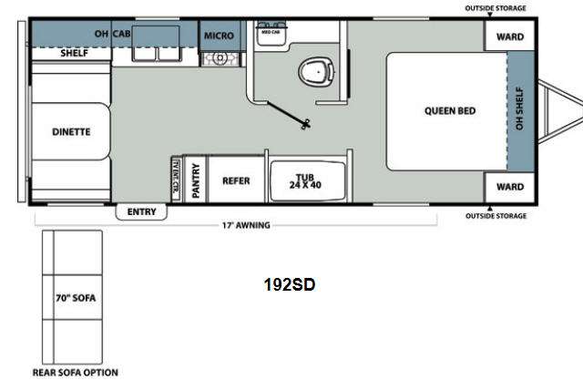 Private Front Bedroom! Tub Shower!Catalina Santara Series Travel Trailer w/Rear Booth Dinette Including: Shelf, Overhead Cabinets, Dbl. Kitchen Sink, 3 Burner Range, Microwave, TV Ent. Center, Pantry, Refrigerator, Walk-Thru Bath w/Private Toilet & Sink w/Med. Cabinet, 24x40 Tub, Front Queen Bed w/Wardrobes Both Sides of Bed, Overhead Shelf, Outside Storage in Front, 17' Awning and Much More! Available Options May Include: Rear 70" Sofa IPO Dinette.