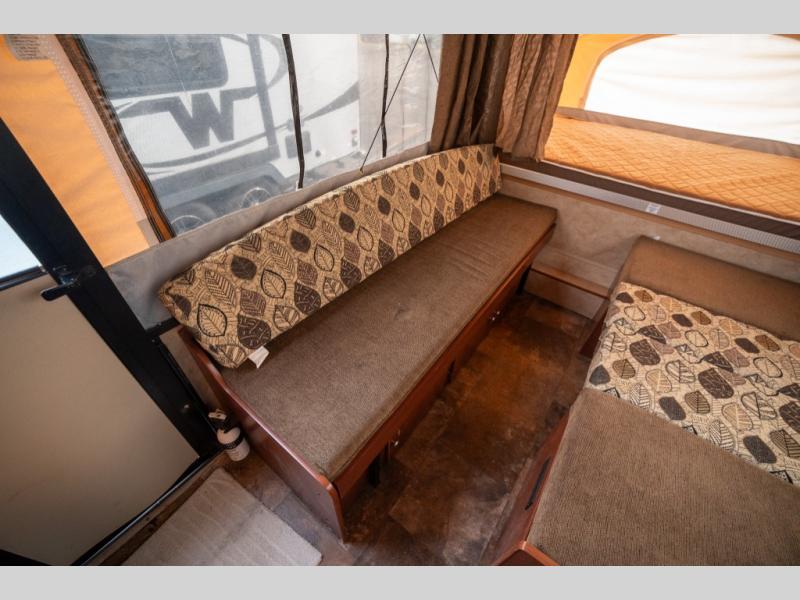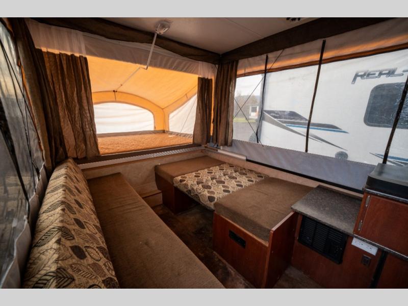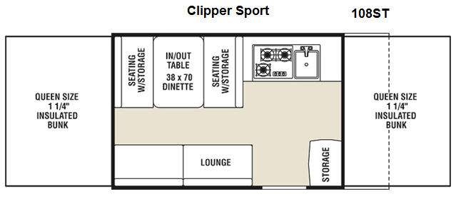 Take this 108ST Clipper Sport folding camper on your next outing and enjoy your time away no matter what the weather is like. No more crawling out of a tent where everything is damp from the ground whether by rain or a heavy dew. You will sleep all comfy and cozy in this unit with ample sleeping provided by two queen size 1-1/4" insulated tent end bunks. The dinette can also be made into a bed for sleeping if you need the extra room. Enjoy plenty of storage with a storage cabinet just inside the entry door, also beneath both dinette seats, and in a slide-out tray in the front of the camper. Wake up and put on a pot of coffee with the convenience of a 3-burner range and clean-up is made easy with a kitchen sink. Enjoy the extra seating space with a lounge directly across from the dinette and so much more!