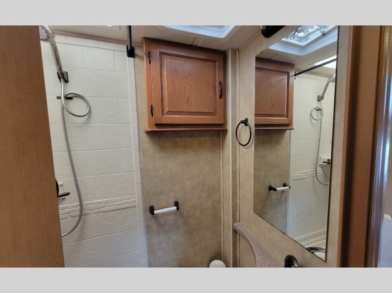 You will enjoy traveling in model 24G with its front slide out reclining sofa including overhead cabinet and a pedestal table. There is also additional storage above the cab area in front.