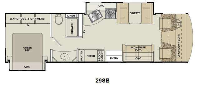 Model 29 SB features a jack-knife sofa to the right of the entry door which includes overhead storage. There is a drop down bunk above the cab area for additional sleeping space if needed also.