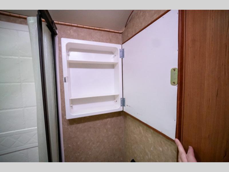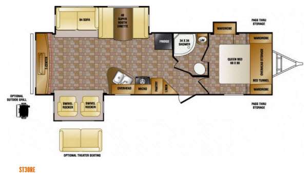 To the left of the entrance you will find a linen cabinet, pantry, three burner range, microwave, and a double kitchen sink. One slide offers two swivel rockers. You can even choose optional theater seating in place of the swivel rockers. The other slide has a sofa and a super booth dinette. Next to the booth there is a refrigerator. Along the rear wall you will find an entertainment center.