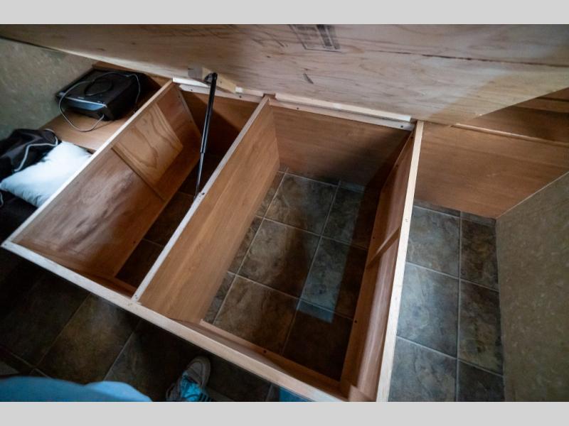 There are plenty of overhead cabinets throughout the travel trailer as well as a pass thru storage area.