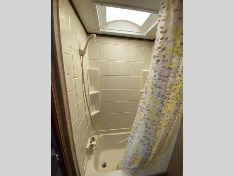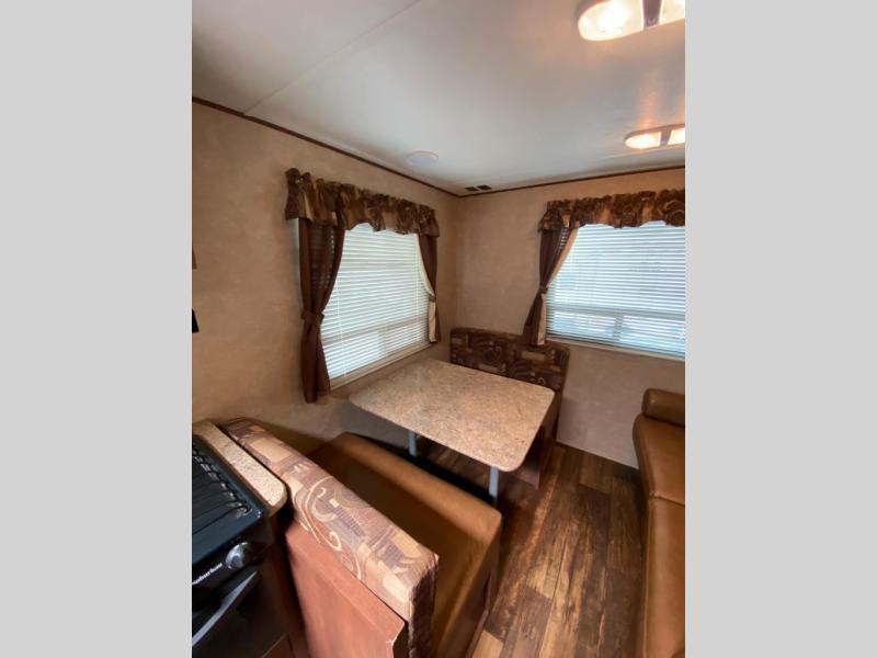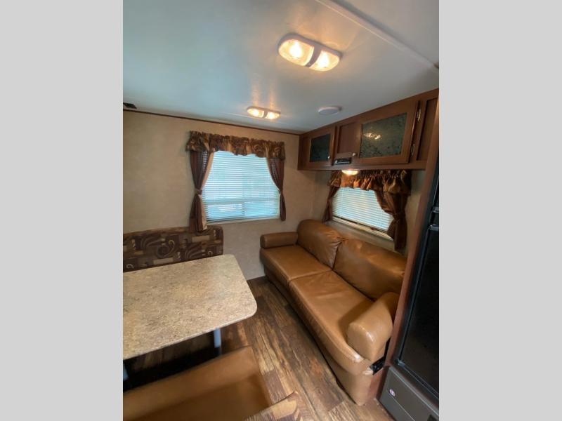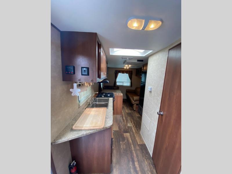 Step inside and you’ll find a surprisingly spacious and cozy interior with room to sleep up to 6. A comfortable queen bed sits up front, while the rear dinette and sofa convert into additional sleeping space. The full kitchen includes a 3-burner cooktop, oven, microwave, and double-door fridge, making meal prep a breeze wherever the road takes you. Enjoy a private bathroom with a tub/shower combo and full vanity, plus ample storage throughout for all your travel essentials.