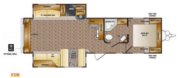 There are plenty of overhead cabinets throughout the travel trailer as well as a large exterior pass thru storage area. You can even choose an optional grill.