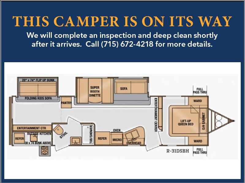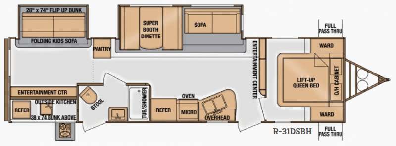 The family friendly Radiance R-31DSBH travel trailer includes a rear bunk house and a front bedroom.