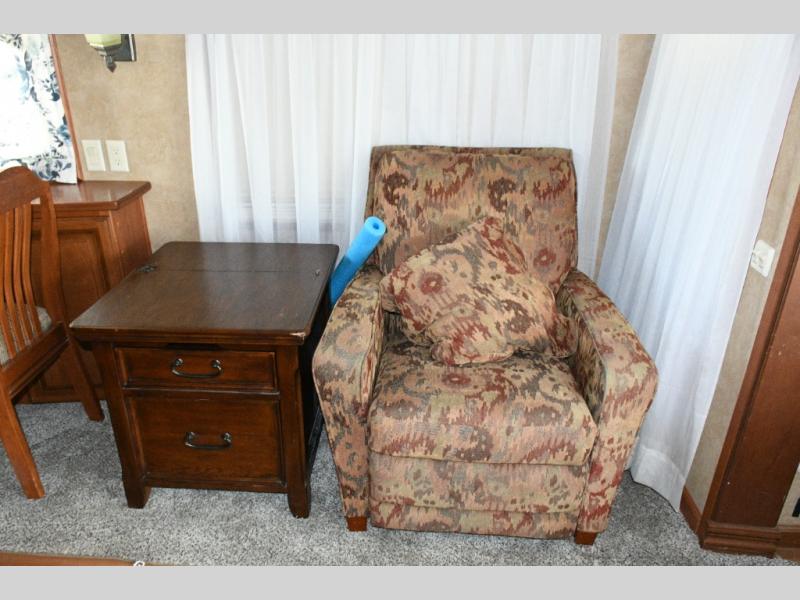 Rear Living Area: Sofa with end tables and overhead storage, plus slide-out lounge chairs and dining table with chairs
