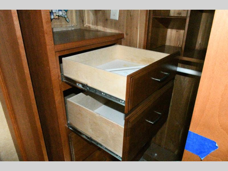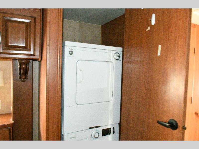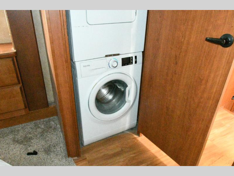 Bedroom Retreat: Front king bed slide with nightstands, vanity with drawers and shelves, walk-in closet, dresser, and washer/dryer prep