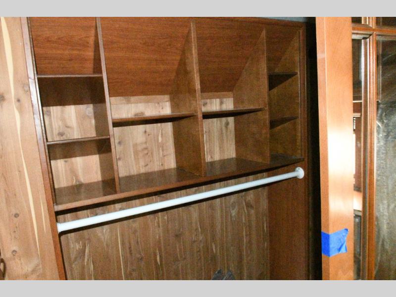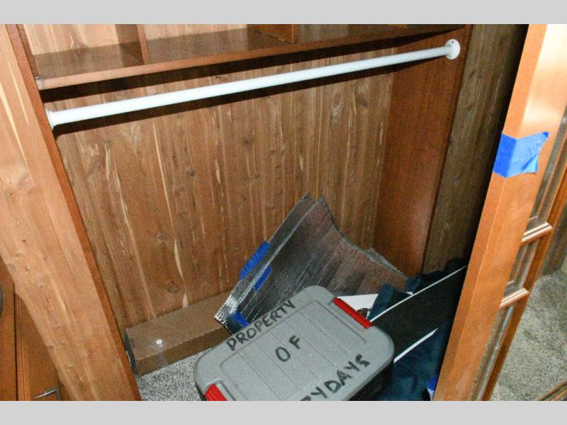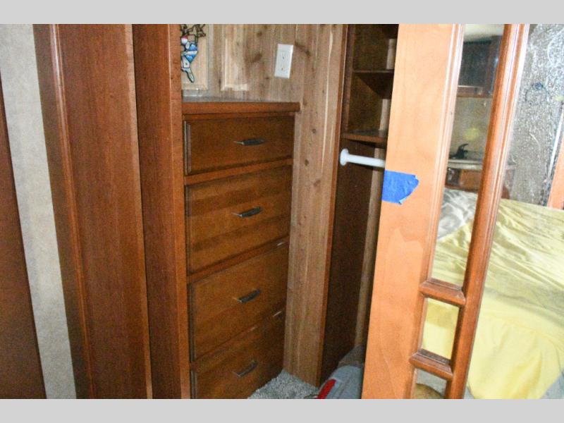 Bedroom Retreat: Front king bed slide with nightstands, vanity with drawers and shelves, walk-in closet, dresser, and washer/dryer prep.