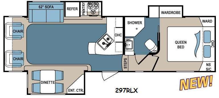 Step inside model 297RLX and be greeted by a wide open combined kitchen and living space with dual slides opposite one another. The slide to the left of the entry door features a corner entertainment center and free standing dinette table with four chairs.