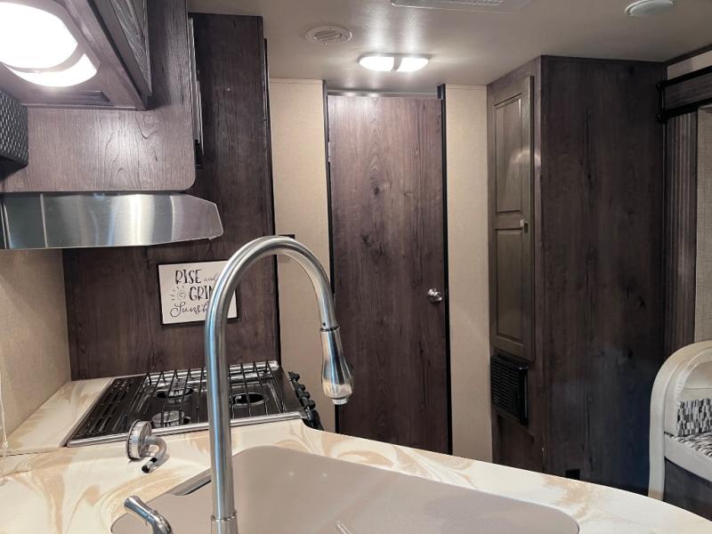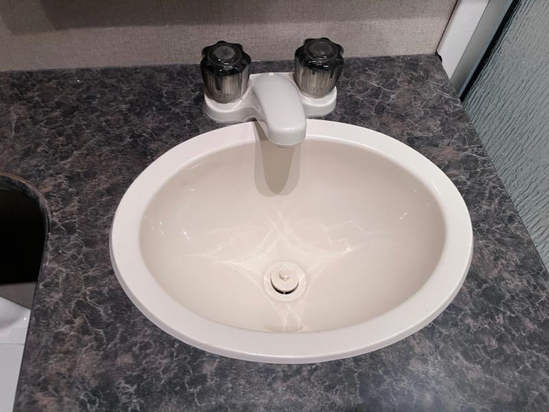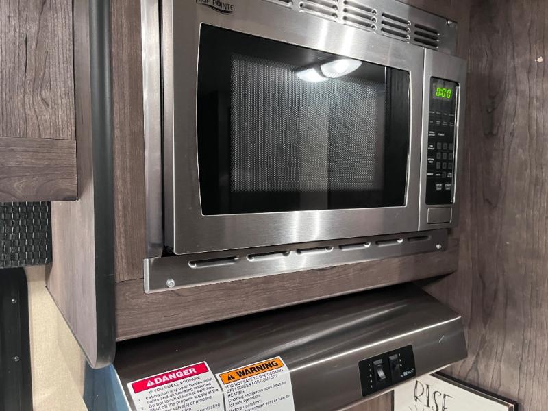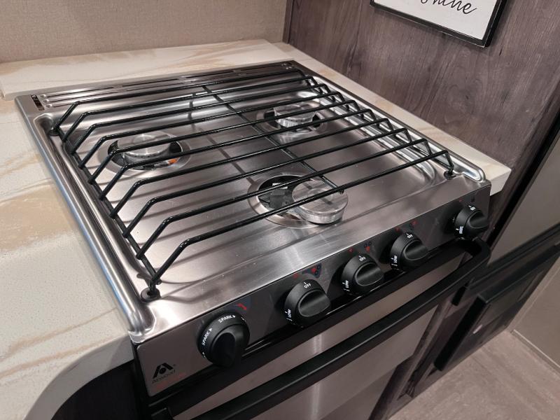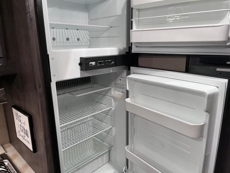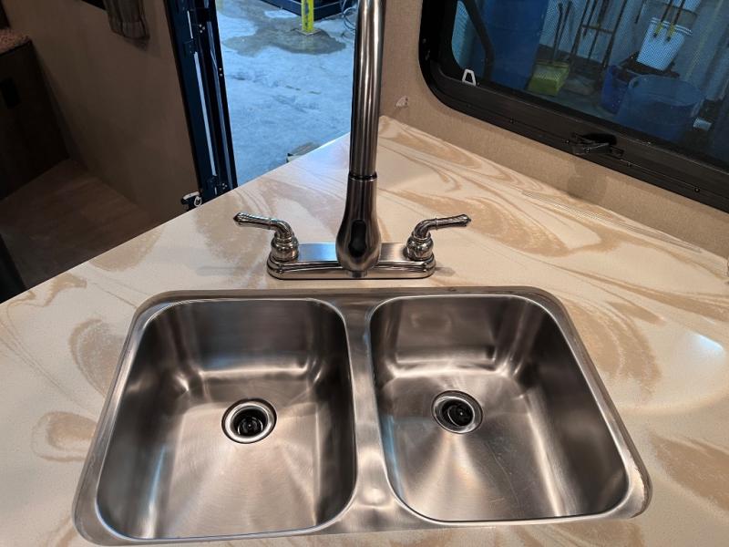 The kitchen offers a double sink, three burner range, microwave oven, and refrigerator. There is a pantry just to the side of the dinette slide for dry good storage also.