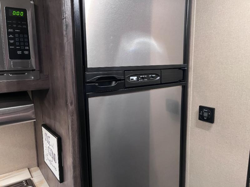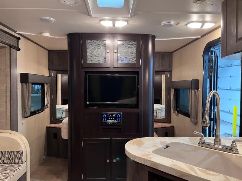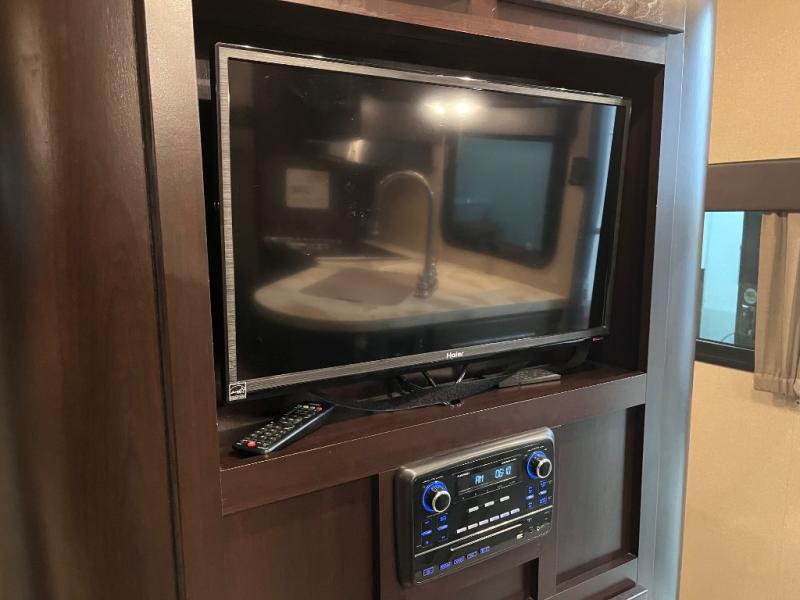 An entertainment center is located just off the foot of the bed for your enjoyment, and can easily be viewed from the oversized u-shaped dinette slide-out.