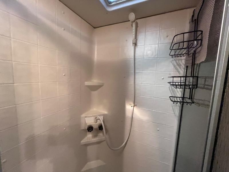 The rear complete bath features an angled shower with skylight, vanity with sink, toilet, wardrobe, and two linen cabinets, plus so much more!
