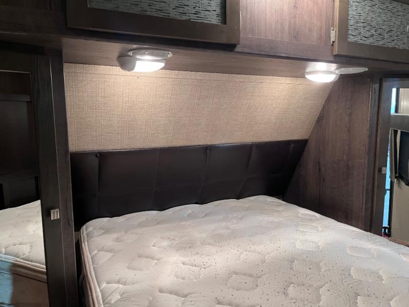 Step inside and notice the queen bed in front with wardrobes for storage on either side of the bed. There is also an overhead cabinet and front pass-through storage plus beneath the bedroom.