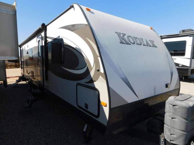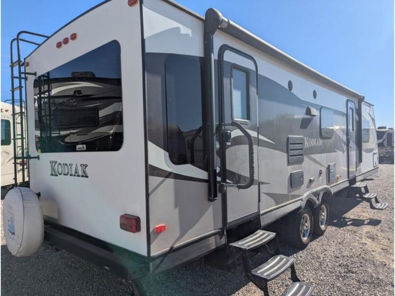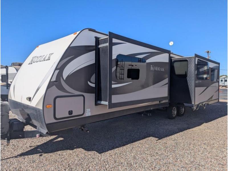 This Kodiak Ultimate travel trailer 298RLSL features a rear living layout, double slides for added interior space, and dual entry doors for convenience.