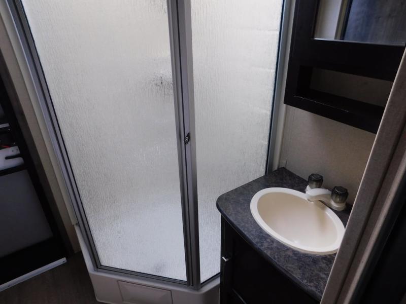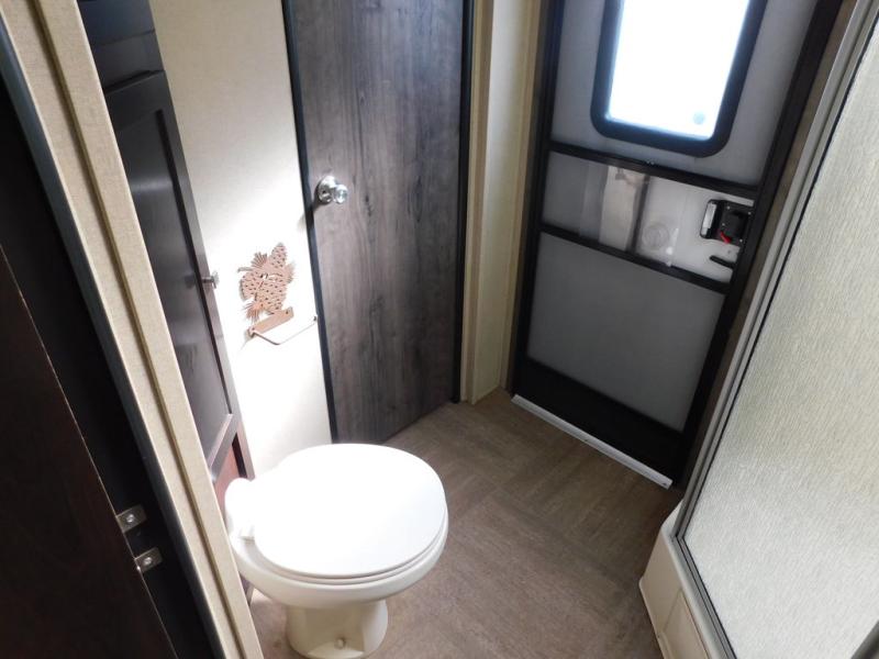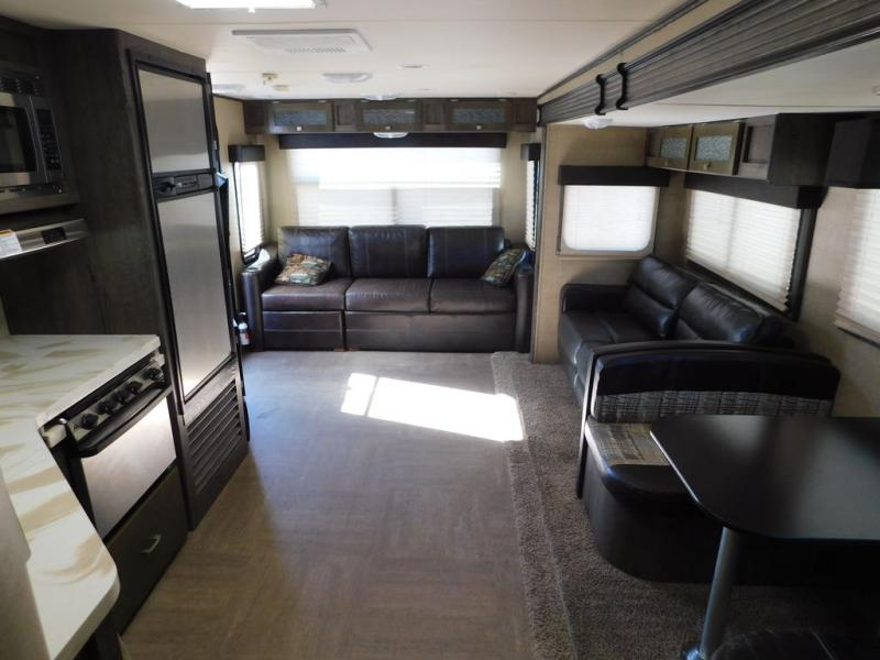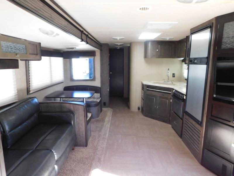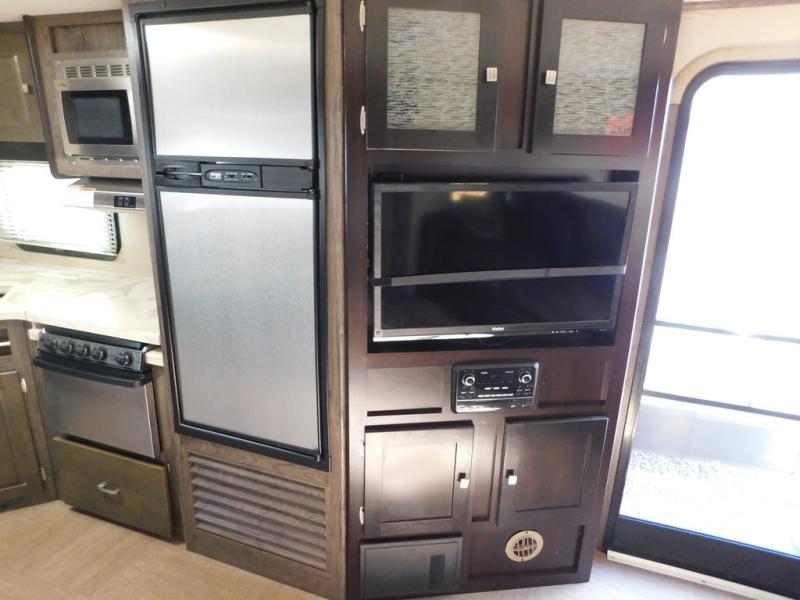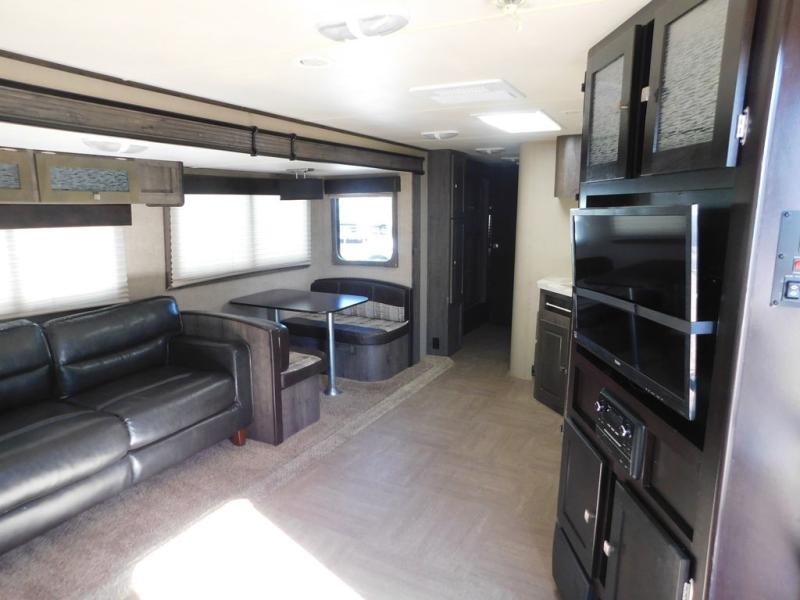 Straight in from the entry door you will notice two chairs with overhead cabinets, and a 40" x 74" booth dinette slide out. There is an entertainment center with storage below the TV area to the immediate right of the door. The entertainment center can easily be viewed by all of the seating in the room.