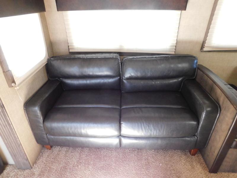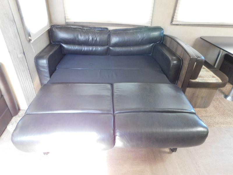 As you step inside the rear most entry door you will see a comfy tri-fold sofa along the back wall. The sofa can easily be made into more sleeping space when needed, and there is also overhead cabinets the entire width of the unit.