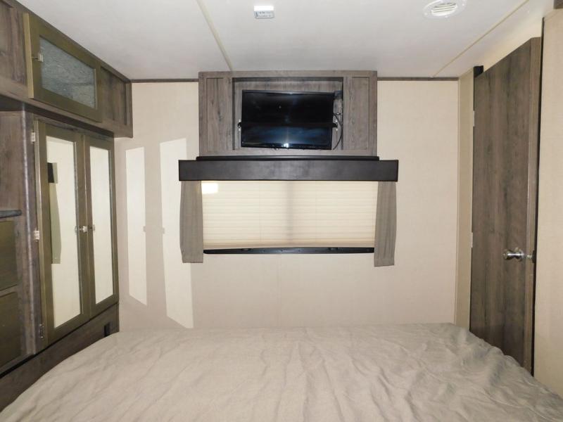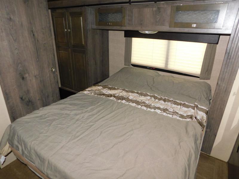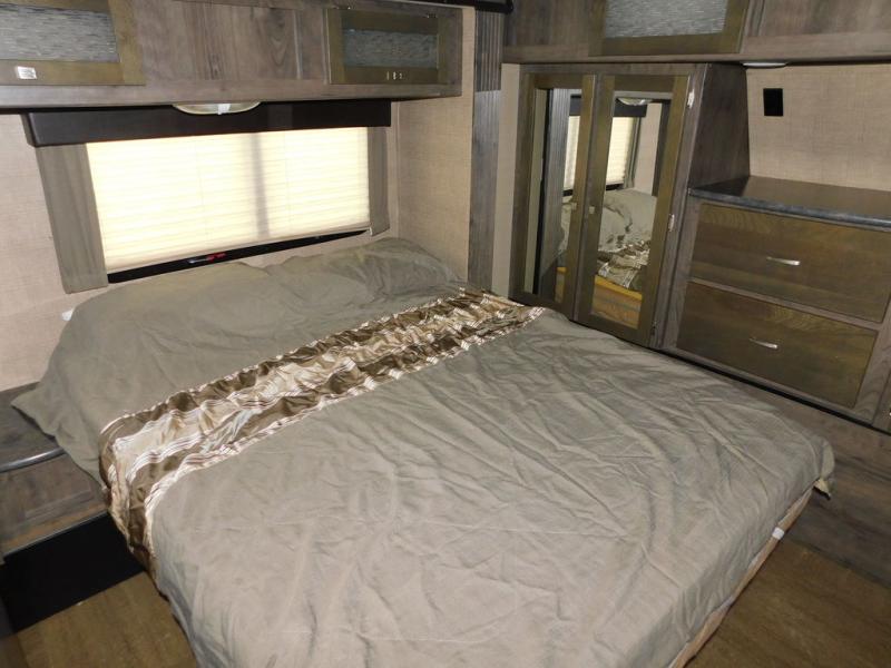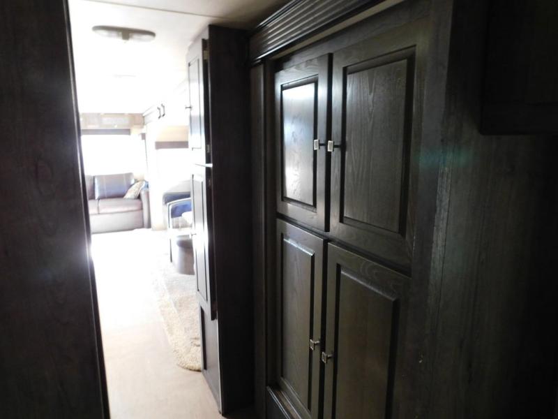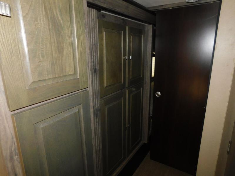 There is a large hall pantry, nightstand, and queen size bed slide-out. The nightstand and bed are just beyond the sliding pocket door. There is a dresser with TV overhead cabinet opposite the foot of the bed. The front wall features two wardrobes on either side of a dresser with overhead storage, and so much more!