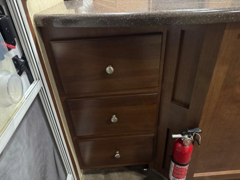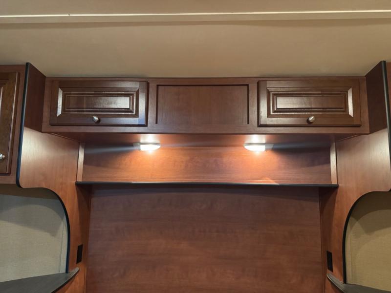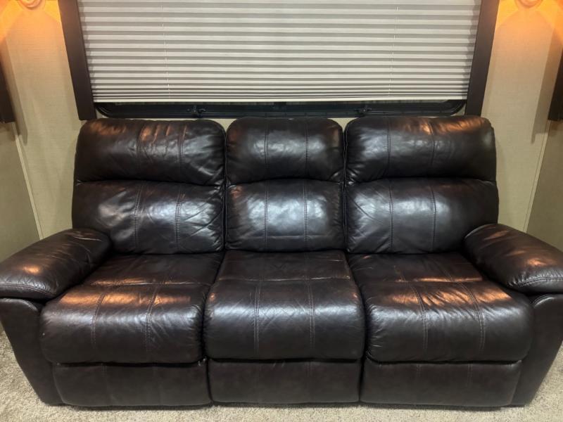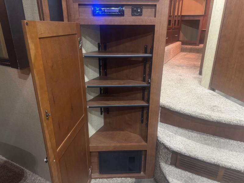 Once inside notice the large slide out reclining sofa seating lounge with stowable table. There is a corner storage cabinet just before the steps that lead up to the front master bedroom and bath.