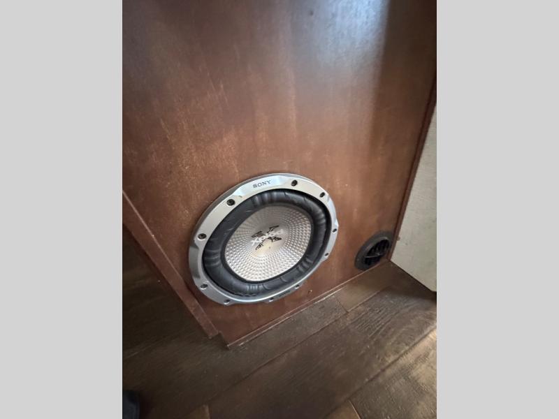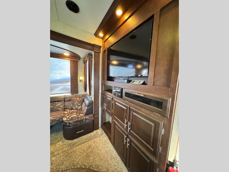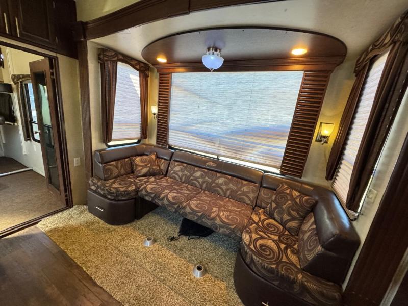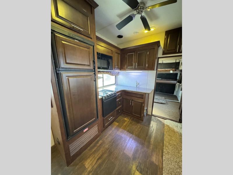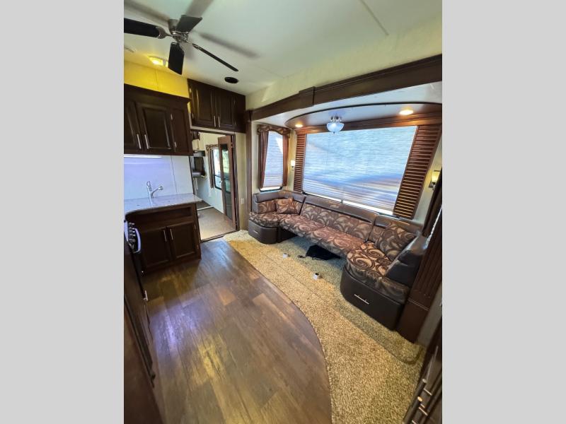 Stepping inside the fifth wheel, to the left there is a refrigerator, three burner range, double kitchen sink, and extra counter space. On the opposite side of the fifth wheel you will find a u-dinette slide. Next to the slide there is a large entertainment center.